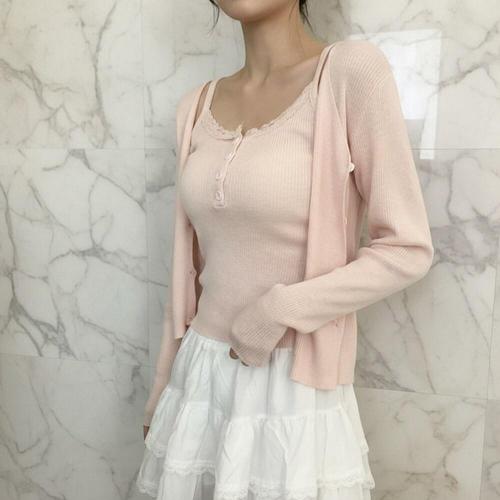 [미라클세븐]여성용 브이넥 레이스 버튼 나시와 골지 가디건 세트