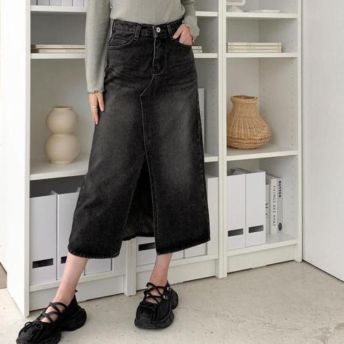 [다잇템]여자 데님스커트 슬릿 검정 사선 롱스커트 (18646047A)