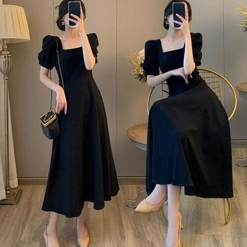 [다잇템]여자 소매 검정 스퀘어넥 에이라인 롱 원피스 (10646828A)