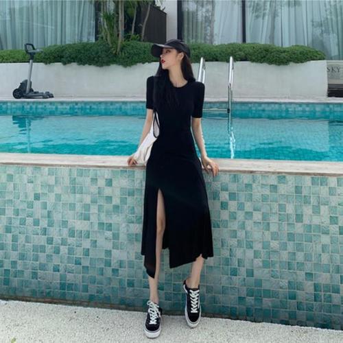 [다잇템]여자 미니멀리즘 U넥 반소매 슬릿 검정 원피스 (10586472A)