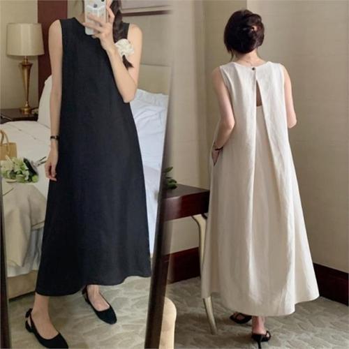 [다잇템]여자 슬릿 마원단 미색 슬리브리스 검정 원피스 (8904356A)