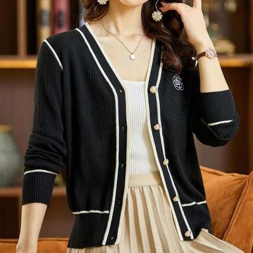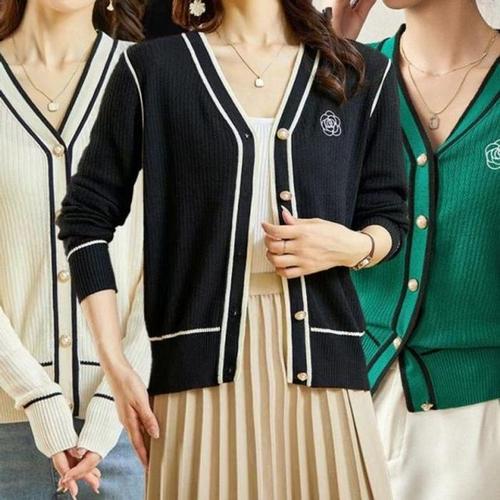[주식회사 브이와이][JHQRLU64_4B]니트 단추 브이넥가디건 골지 봄 배색 블랙 (23870013A)