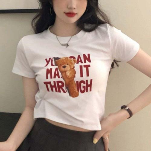 [오너클랜]인기상품 여성 라운드넥 반팔 크롭 티셔츠 곰돌이 프린트 데일리 캐주얼 면 티 [WFLL96M_260304]