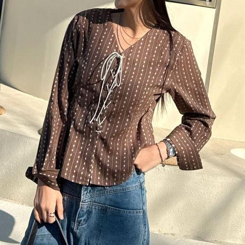 [다잇템]여자 끈있는 히피 리본 꽃무늬 블라우스
