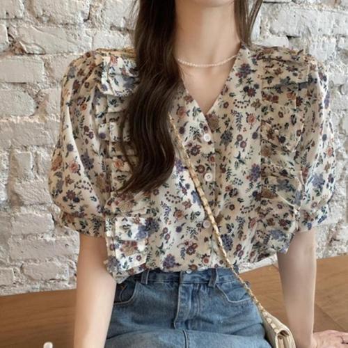 러블리 쉬폰 꽃무늬 블라우스 퍼프 긴팔 봄가을