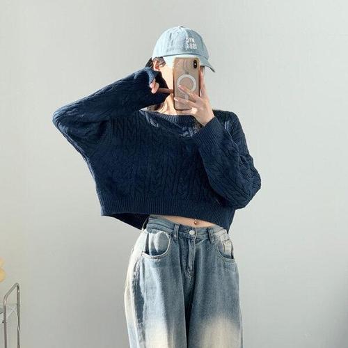 [굿쇼핑몰_의류]모던 내추럴 세미크롭 꽈베기 케이블 루즈핏 니트