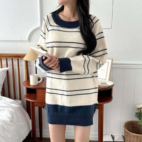 [오너클랜]인기상품 데일리 스트라이프 라글란 배색 니트 원피스 캐주얼 단가라 드레스 [WFLLKHL_260305]