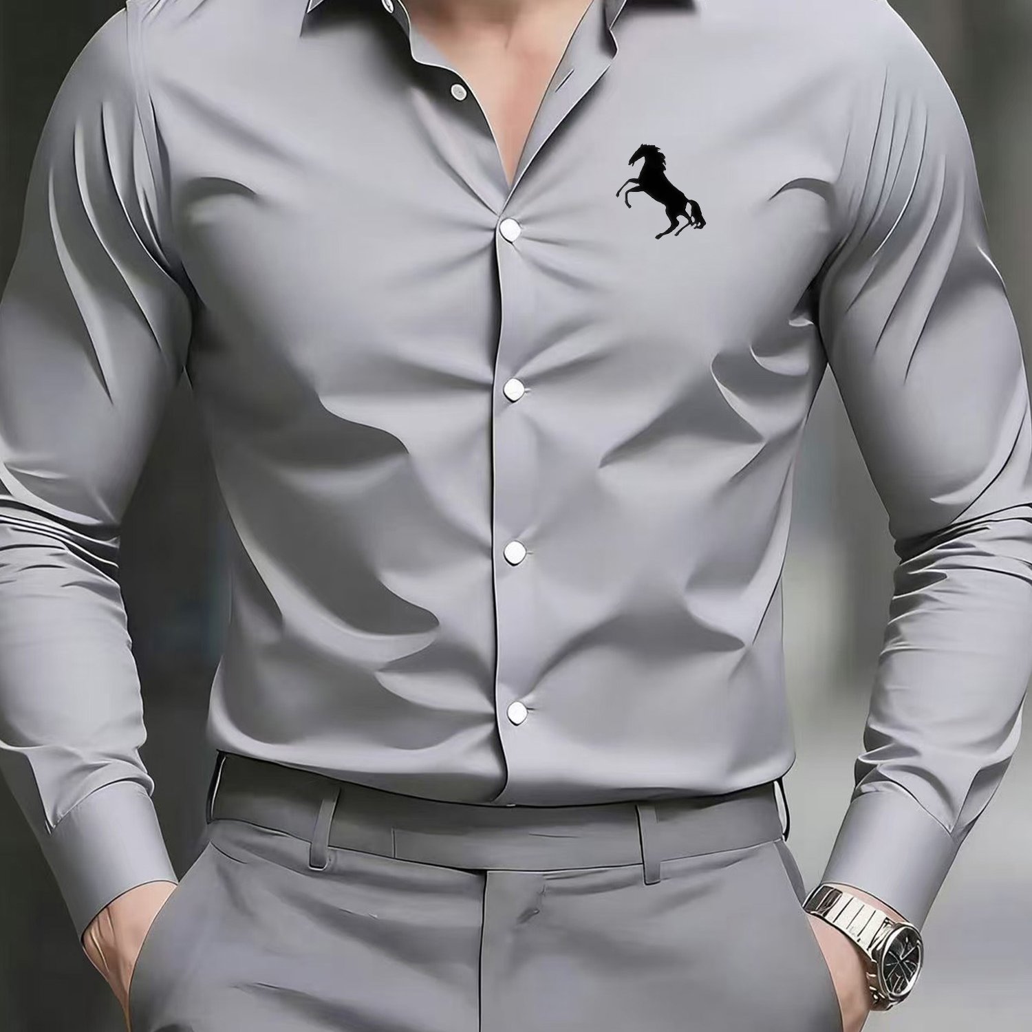 TEMU 말을 달리는 문양, 대비되는 칼라, 전통적인 버튼 앞면 디자인의 남성용 긴팔 셔츠. 세탁기 사용 가능하며, 캐주얼하고 반공식적인 모든 행사에 적합합니다.