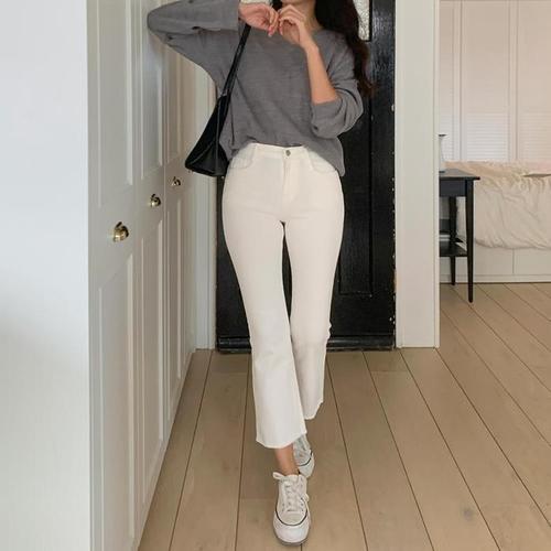 뱅뱅 HC04 봄여성 인밴드크롭 흰색 부츠컷청바지 화이트 나팔모양 바지 면