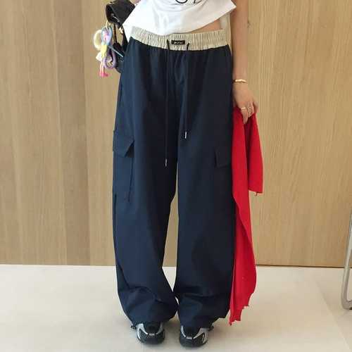 엔터 라벨 배색 밴딩 하이웨스트 와이드 조거 카고 포켓 팬츠 (4color)