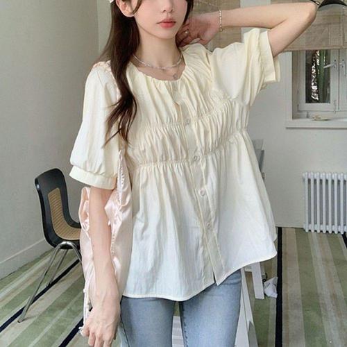 [오너클랜]인기상품 여름용 여성 노카라 셔링 반팔 플레어 블라우스 셔츠 [WFLI053_260227]