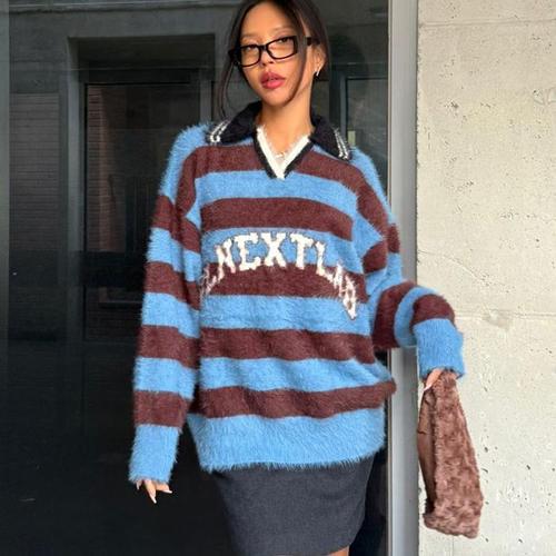 [다잇템]여자 카라넥 브이 줄무늬 털스웨터 박스 니트 (23730119A)