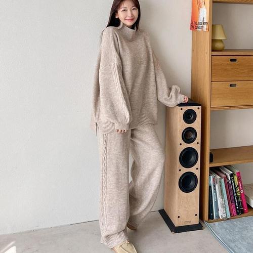 [다잇템]여자 박스 니트팬츠 꽈배기 하이넥 넓은 세트 (11311929A)