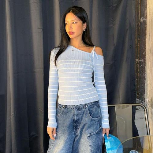[셀럽하우스]여성 GBIY7500 스트라이프 원 숄더 리본 니트 티 3color