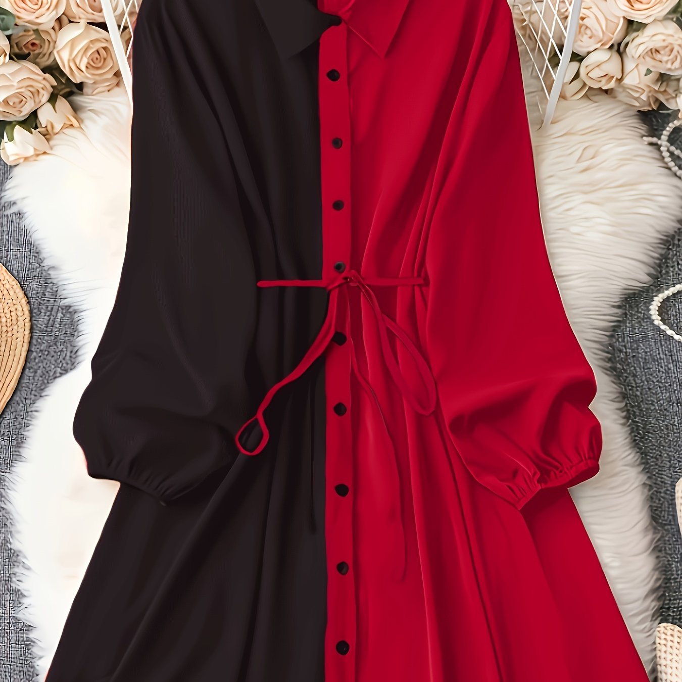 TEMU 플러스 사이즈 - 여름 여성용 플러스 사이즈 유니크 컬러 블록 드로스트링 허리 긴팔 셔츠 원피스