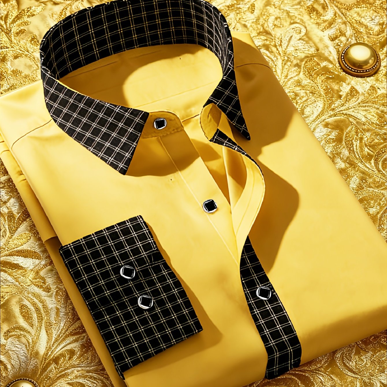 TEMU 남성용 체크무늬 컬러 블록 레귤러 비즈니스 포멀 롱 싱글 브레스트 셔츠, 실버 엣지 버튼