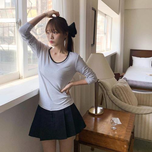 [옷자락] 여자 슬림핏 라운드넥 스트라이프 레이어드 긴팔티