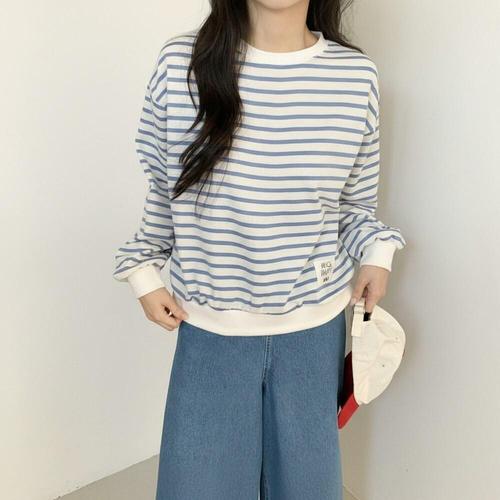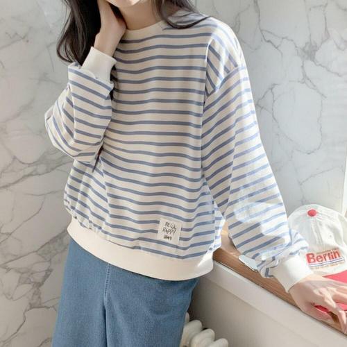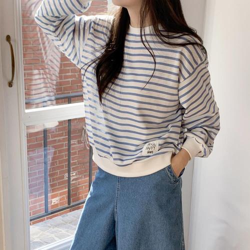 데일리앤 마이스 봄 가을 여성 루즈핏 라벨 패치 긴팔 스트라이프 맨투맨 티셔츠