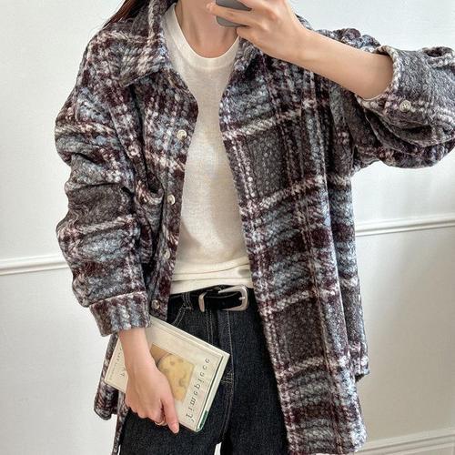 [다잇템]여자 뽀글이 체크셔츠 덤블 주머니 언발 자켓 (23730182A)