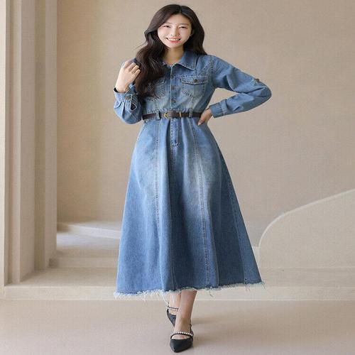 [스타일온미][스타일온미] 헤몬 벨트SET 절개 스티치 A라인 데님 롱 플레어 원피스