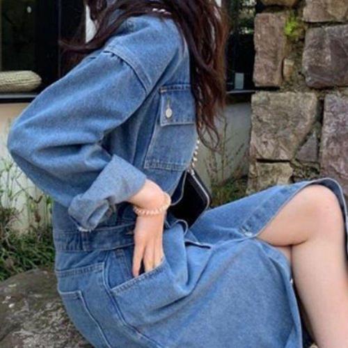 여성 블루 긴팔 셔츠 원피스 허리조임 롱 데님 원피스