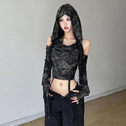 [오너클랜]인기상품 크롭 후드 긴팔 트임 끈 프린트 데미지 티셔츠 [WFLLCDI_260305]