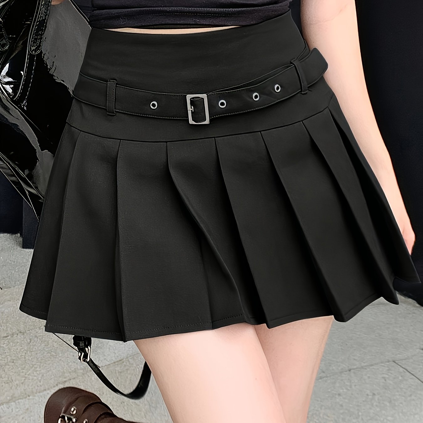 TEMU 솔리드 컬러 미니 스커트, 우아한 플리츠 A라인 블랙 스커트, 데일리 웨어에 적합