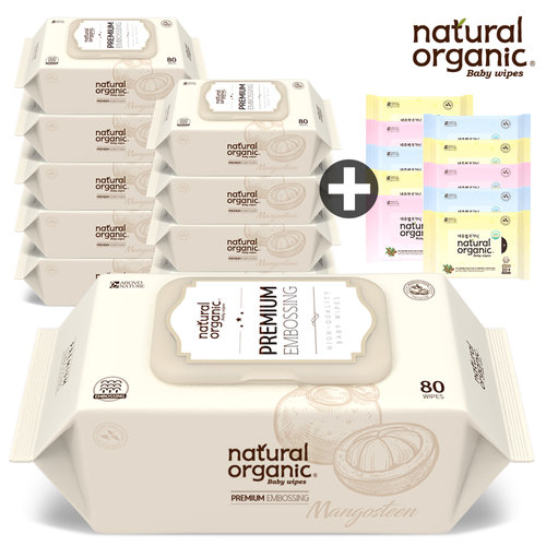10+10 [네츄럴오가닉] 아기물티슈 프리미엄 엠보싱 캡형 80매(10팩) + 프리미엄 휴대 손입티슈10매(10팩)