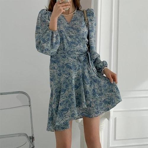 [옷자락]여자 셔링 랩 진주체인 벌룬 딥브이 미니원피스