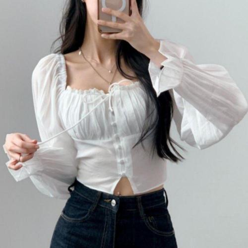 [오너클랜]인기상품 여성 오프숄더 레이스 셔링 스모크 크롭 블라우스 [WFLLSRF_260305]