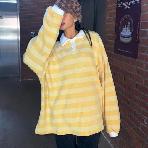 여성 겨울 배색 카라넥 스트라이프 럭비 티셔츠 루즈핏 레드 니트