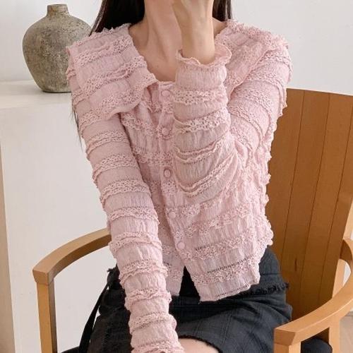 [신상오픈런]|CSJ6D8A|여성 봄 벚꽃 스타일 펀칭 프릴 레이스 카라넥 가디건_24580393_597559