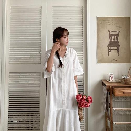 [다잇템]여자 여성스러운 V넥 소매프릴 롱원피스 (10516000A)