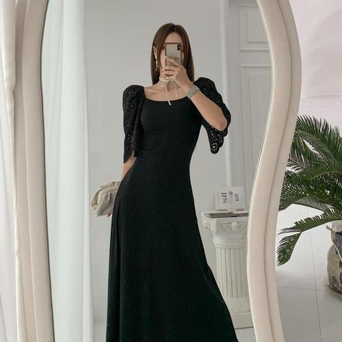 [다잇템]여자 카라 SS 검정 반소매 롱 레이스 원피스 (10616323A)
