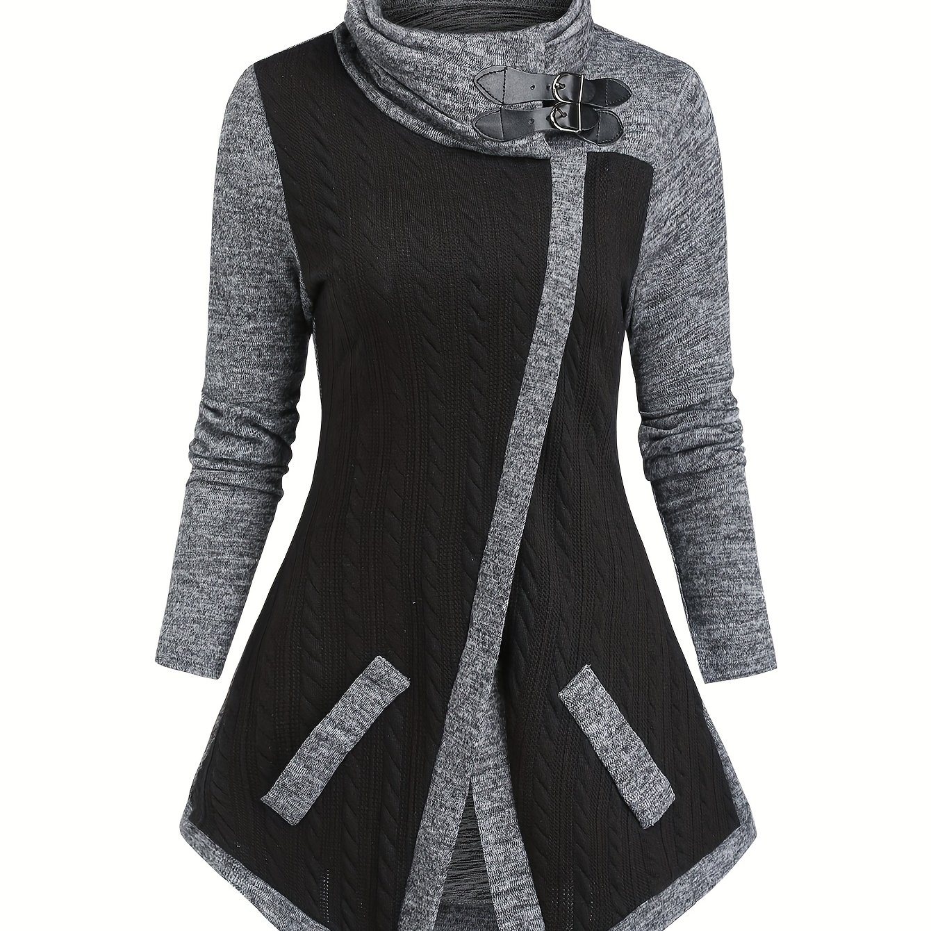 TEMU 여성용 우아한 하이넥 롱라인 블라우스 - 그레이 컬러블록 칼라 탑, 봄/가을 세탁기 사용 가능 아우터웨어, 캐주얼부터 드레시까지 다용도 긴팔 셔츠
