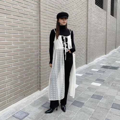 여자 레이스 롱나시 앞트임 레이어드 시스루 롱원피스