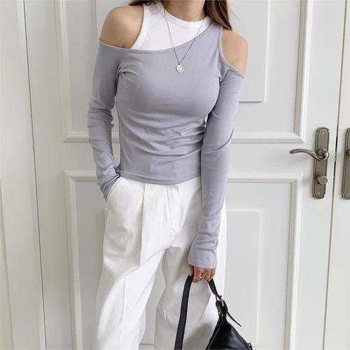 [다잇템]여자 슬리브리스 숄더 U넥 롱슬리브 티셔츠 (10078982A)