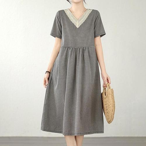[퀸이즈] [~77까지]빅사이즈 초닐 체크 포인트 브이넥 반팔 롱원피스