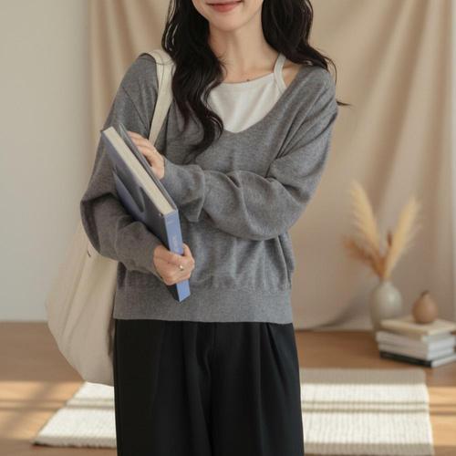 [옷자락] 여성 봄가을 데일리 루즈핏 레이어드 브이넥 니트