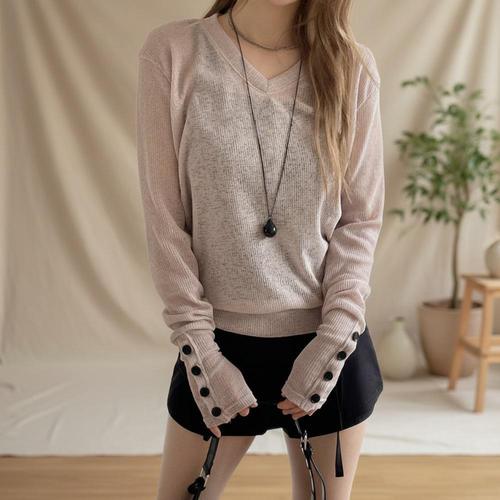 [옷자락] 여성 린넨 혼방 브이넥 루즈핏 시스루 니트 소매버튼