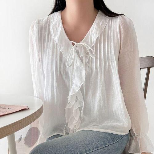 [옷자락]여자 봄하객룩 핀턱 러플 프릴 퍼프 리본끈 블라우스