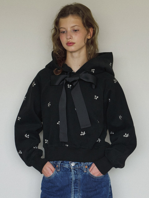 [히비스커스블룸] 보니 플라워 자수 스티치 리본 후디_블랙 플라워