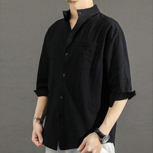 코튼 린넨 셔츠 남성 헨리 넥 포켓 캐주얼 비치 반소매 솔리드 컬러 남성 탑 티셔츠 빈티지 streetwear