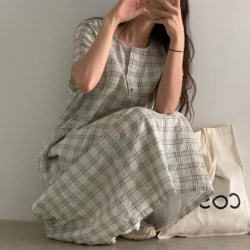 [다잇템]여자 버튼 린넨원피스 U넥 반소매 롱원피스 (15553661A)