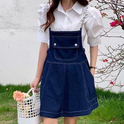 여성 귀여운 빈티지 데님 청 멜빵 원피스