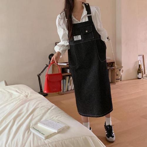 [다잇템]여자 진청 일자 스커트 서스펜더 진 롱 원피스 (10583709A)