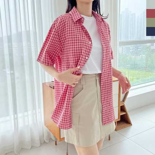 옷자락 / 여자 면혼방 체크 시어서커 루즈핏 롱 반팔 남방