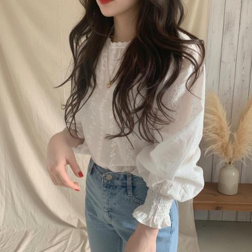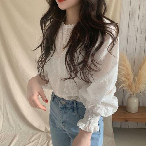 [다잇템]여자 면원단 비침 잔주름 레이스 블라우스 (8629129A)