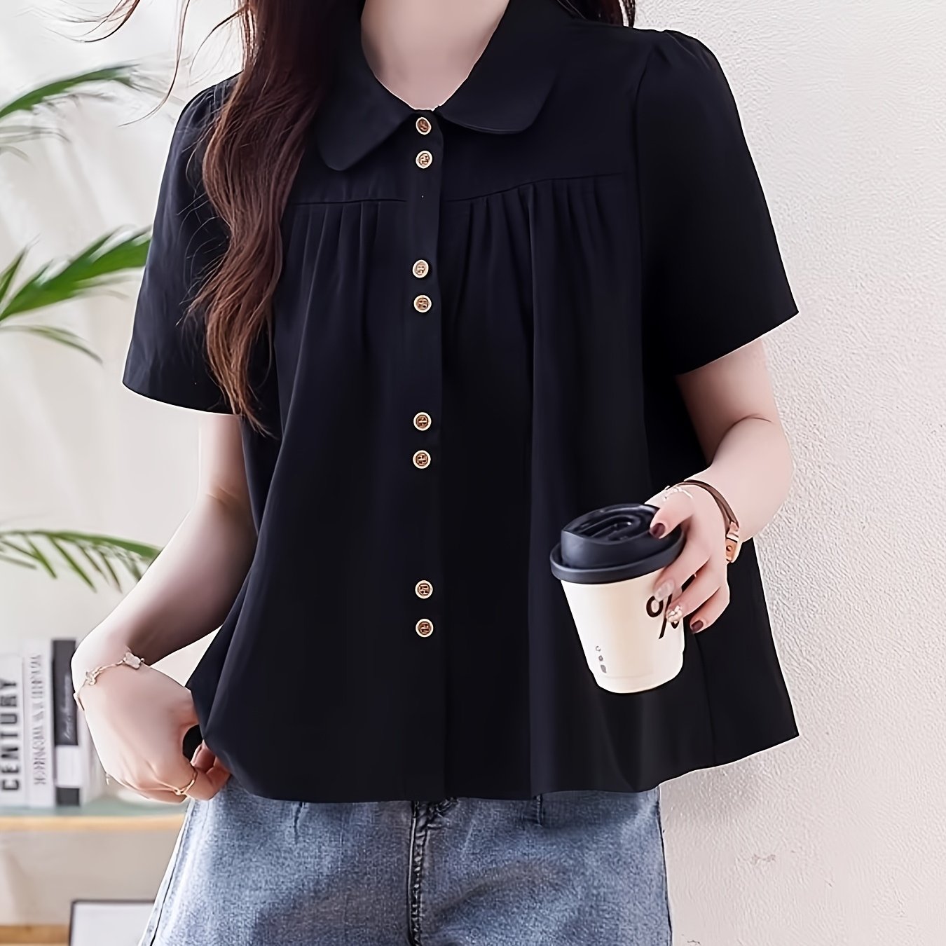 TEMU 페터팬 칼라가 있는 여성용 새로운 여름 디자인 반팔 셔츠, 스타일리시하고 매력적이며 복부를 가리고 젊어 보이도록 완벽합니다.
