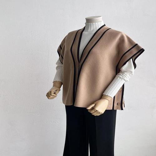 [다잇템]여자 V넥 모양 단추 포인트 조끼 반소매 가디건 (10954056A)
